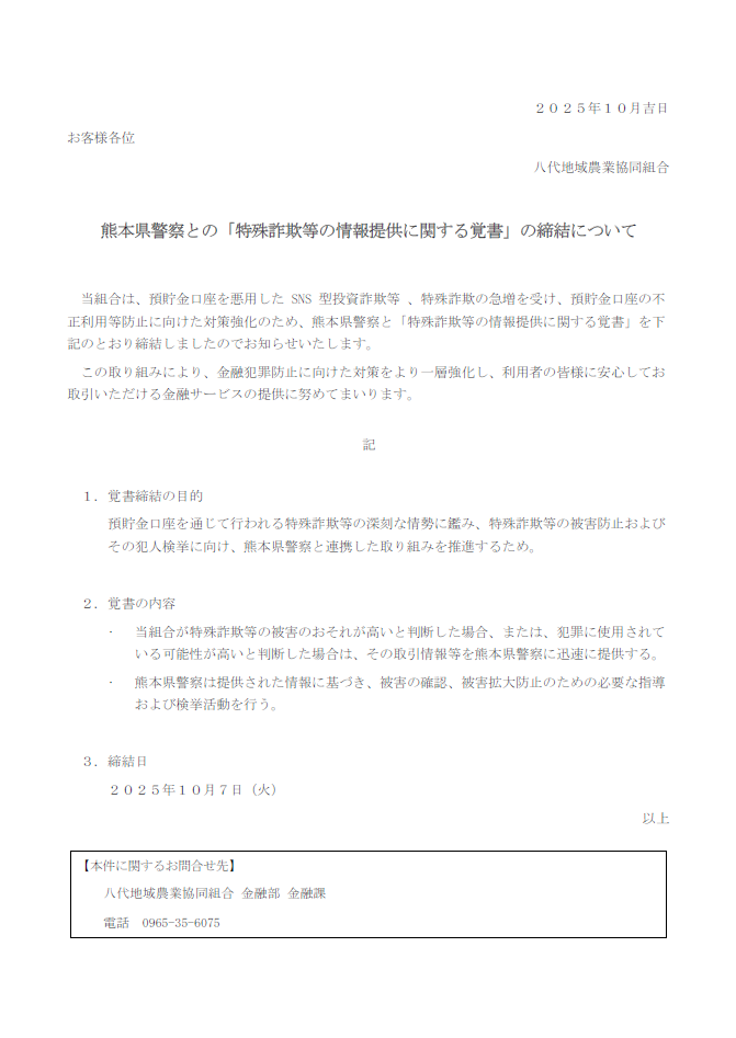熊本県警察との「特殊詐欺等の情報提供に関する覚書」の締結について